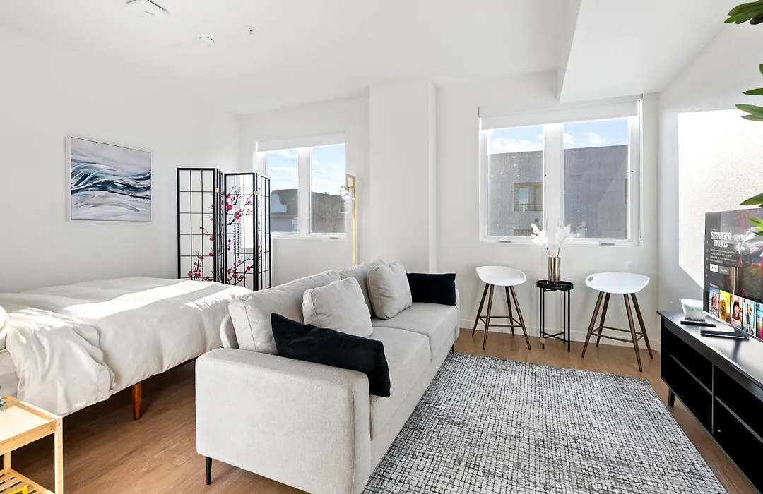 Bright Studio On Sunset Blvd, Free Parking, Gym, And Pool Apartment offers a patio, a balcony, and a seating area, as well as comforts like an air conditioner. For added convenience, a hot tub, a separate toilet, and a shower are available at the accommodation. Additionally, you'll find dryers and towels.